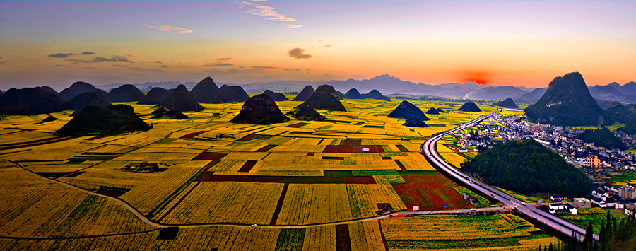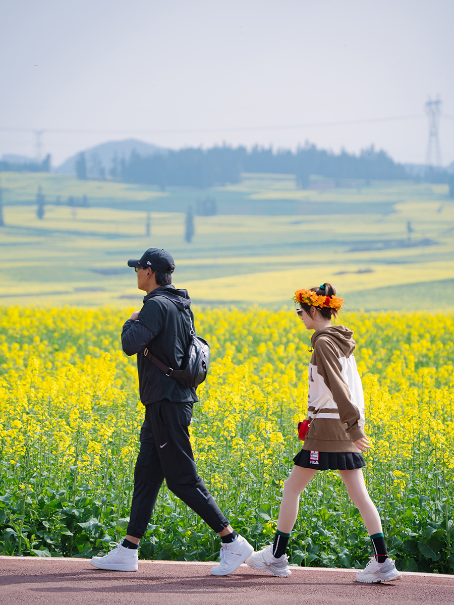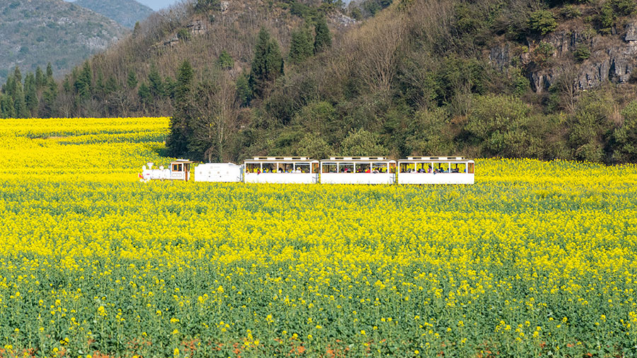 春風(fēng)十里,花海搖曳。坐在峰林上等待一場(chǎng)日出,俯視這翻滾的油菜花浪,隨金雞峰和日出一起起舞,融入100萬畝花海中,成為一抹風(fēng)景。游客也可以坐上觀花火車,穿越在花海之中,感受別樣美好春光。