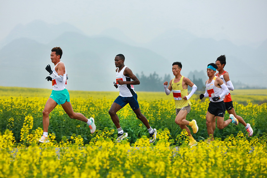 (2023年2月25日,來自國(guó)內(nèi)外的馬拉松專業(yè)選手在花海中奔跑。圖片/袁國(guó)林)