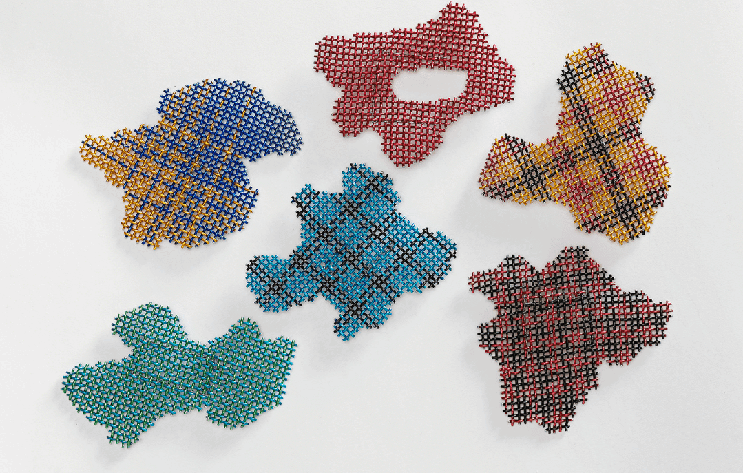 藝術(shù)家作為土生土長的以色列人,經(jīng)常使用在耶路撒冷街頭撿到的石頭,或用金屬網(wǎng)模仿巴以沖突中以色列人用來保護(hù)汽車不受巴勒斯坦人破壞的鐵絲網(wǎng),也會使用交織的卷繞細(xì)銀線將抽象的數(shù)學(xué)公式轉(zhuǎn)化為三維表達(dá)。