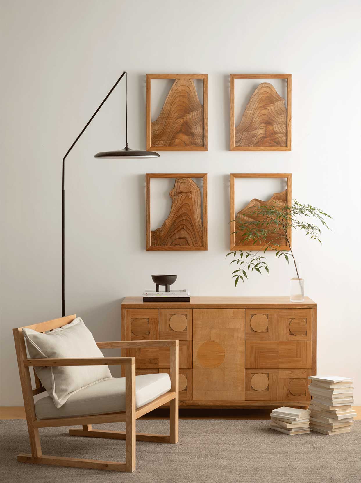旗下品牌“大角木創(chuàng)”,大角即45°最美角度。在人的視覺、聽覺、觸覺等感知中,視覺是感受空間藝術(shù)最直接的方式,而大角木創(chuàng)希望做的是以最美角度構(gòu)造一種能滿足人的生活起居需求,又符合居住的人居空間環(huán)境,讓家具藝術(shù)為現(xiàn)代人生活帶來便利的同時(shí)還帶來更多視覺上的美感和觸覺上的舒適。大角木創(chuàng)傳承華智匠心精神和堅(jiān)持自然之美的品牌基因,引進(jìn)日本櫸木、七葉、檜木、杉木等幾十個(gè)品種為原材料,將自然界的材質(zhì)運(yùn)用于空間的裝飾中,為喜愛木材之人保留它們原來的模樣,在賦予它們新的生命。